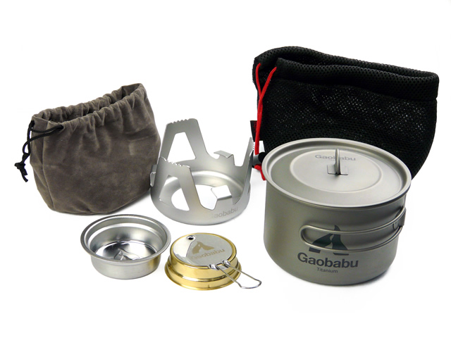 チタンポットSOLO 800(フタ・厚手メッシュ袋付き)、固形燃料トレー + Gaobabuアルコールバーナー 火力調整・消火フタ + 五徳ベース + 五徳ベース収納用きんちゃく袋 以上5点のお得なセット販売です。