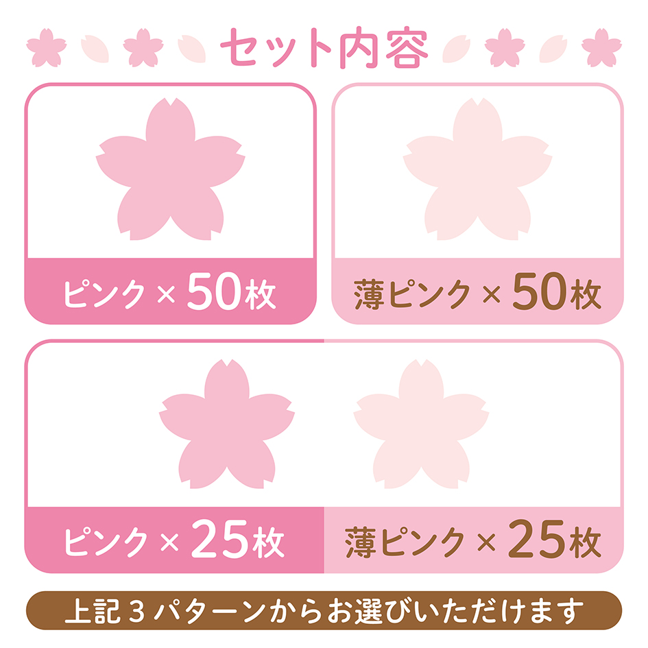 各単色50枚セットと2色が各25枚ずつセットになったハーフの3パターンからお好きなものをお選びいただけます。