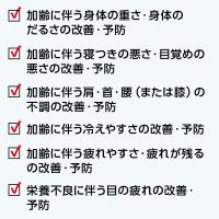 効能・効果 | ★疲労の回復・予防 ★日常生活における栄養不良に伴う身体不調の改善・予防:疲れやすい・疲れが残る・体力がない・身体が重い・身体がだるい、肩・首・腰又は膝の不調、二日酔いに伴う食欲の低下・だるさ、寝付きが悪い・眠りが浅い・目覚めが悪い、肌の不調(肌荒れ、肌の乾燥)、冷えやすい・血行が悪い、目の疲れ ★体力、身体抵抗力又は集中力の維持・改善 ★虚弱体質(加齢による身体虚弱を含む。)に伴う身体不調の改善・予防:疲れやすい・疲れが残る・体力がない・身体が重い・身体がだるい、肩・首・腰又は膝の不調、寝付きが悪い・眠りが浅い・目覚めが悪い、肌の不調(肌荒れ、肌の乾燥)、冷えやすい・血行が悪い、胃腸が弱く腹痛や下痢を起こしやすい ★病中病後の体力低下時、発熱を伴う消耗性疾患時、食欲不振時、妊娠授乳期又は産前産後等の栄養補給 |