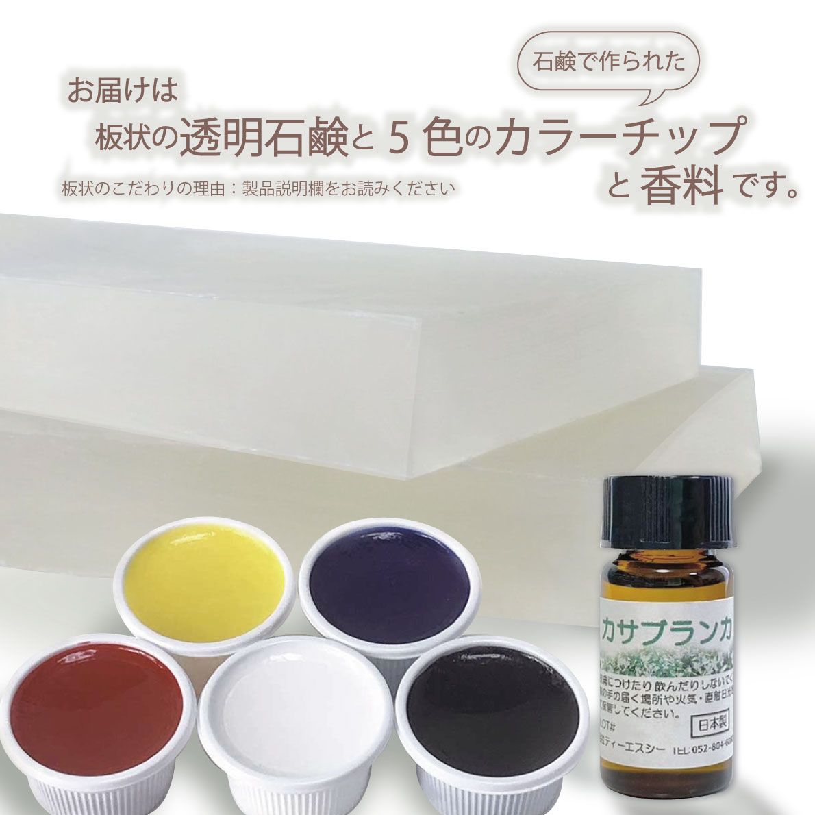 グリセリンソープ 手作りキット 1kg 1000グラム 着色剤(カラーチップ)5色 カサブランカの香りの素5mlセット全国送料無料 〈 手作りせっけん 材料 グリセリンクリアソープ 赤 黄 青 黒 白 カサブランカ 宝石石鹸 MPソープ 透明石鹸 工作宝石せっけん 高学年 子供 小学生 向け メール便対応 〉