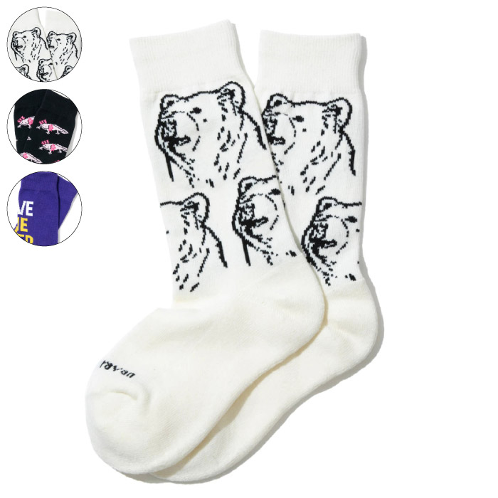 ゴースローキャラバンオリジナル柄のジャガードソックスが登場☆。どれを買おうか迷ってしまう6色展開。クマ・ウーパールーパー・ティピ・ネコ・銭湯・ビール柄の裏パイル仕上げのクルーソックス。サイズは2サイズご用意しております。
