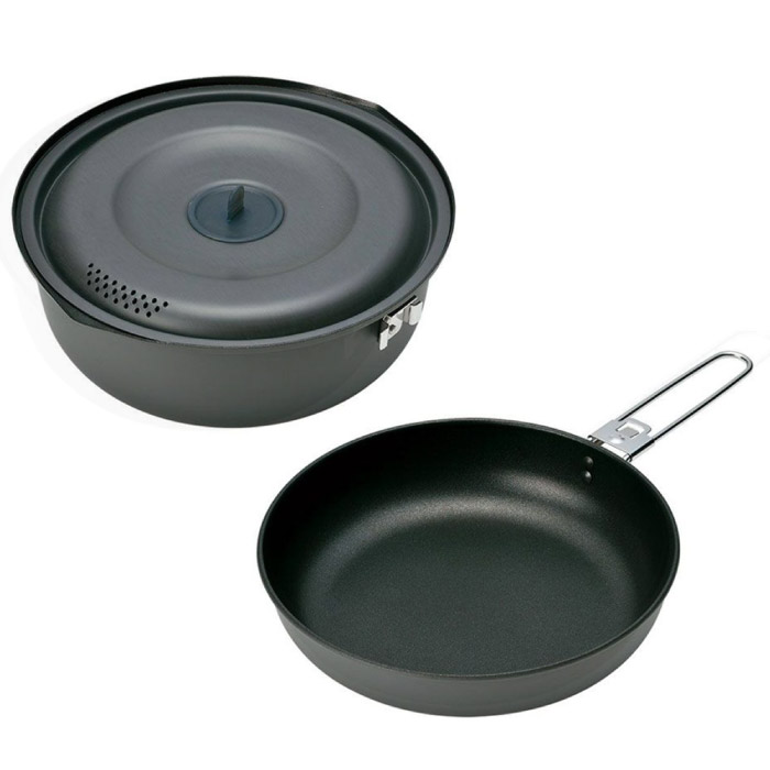 アルミ素材にフッ素加工を施したクッカーとフライパンのコンビで、様々な調理を一台でこなす、実用的クッカーです。