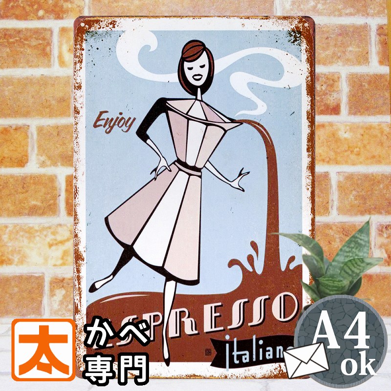 | 【ブリキ看板 k エスプレッソガール】 金属製の個性的インテリアパネル ピンやフックを刺しての壁掛け、立てかけ。どなたでも簡単にお飾りいただけます。 |