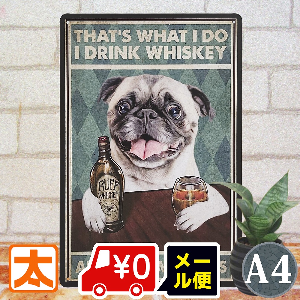 ブリキ看板 パグ ウイスキー ポスター 犬 フォーン お酒 PUG 絵 インテリア雑貨 アートパネル 壁掛け アメリカン雑貨 イラスト モダン かわいい 可愛い