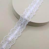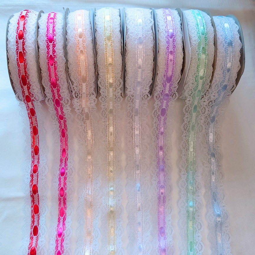 真ん中にサテンリボンを通したレースブレードです。サテンリボンは固定されているので抜けません。