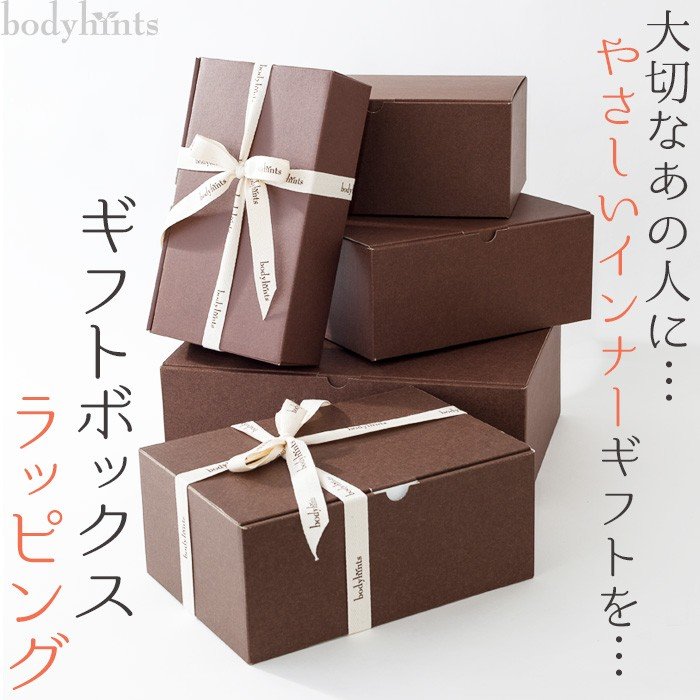 ナチュラルなブラウンボックスに、ボディヒンツオリジナルロゴリボンとメッセージタグを付けてラッピングいたします。心をこめたパーソナルギフトに、ぜひご利用ください。