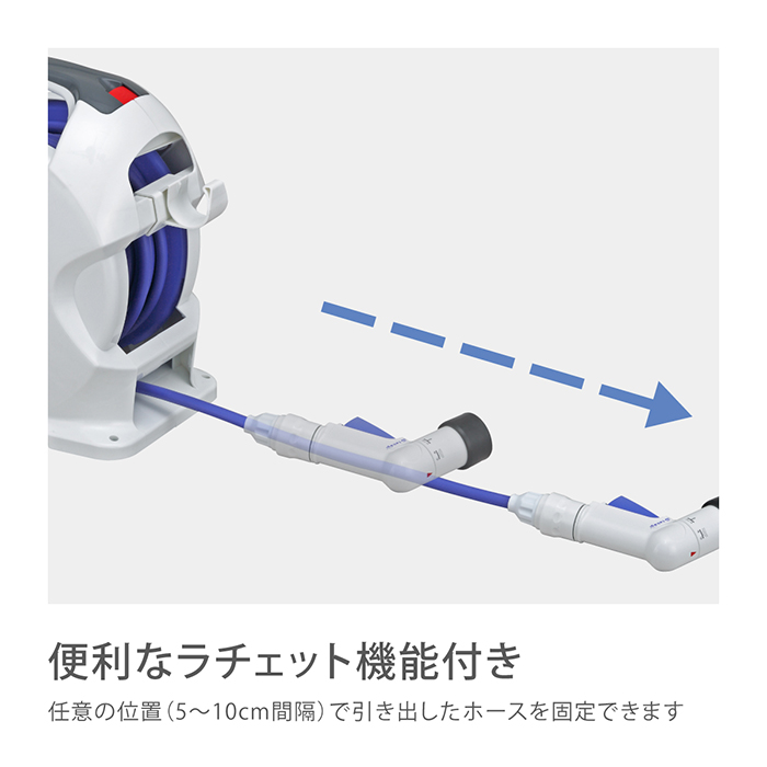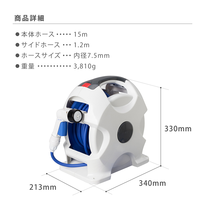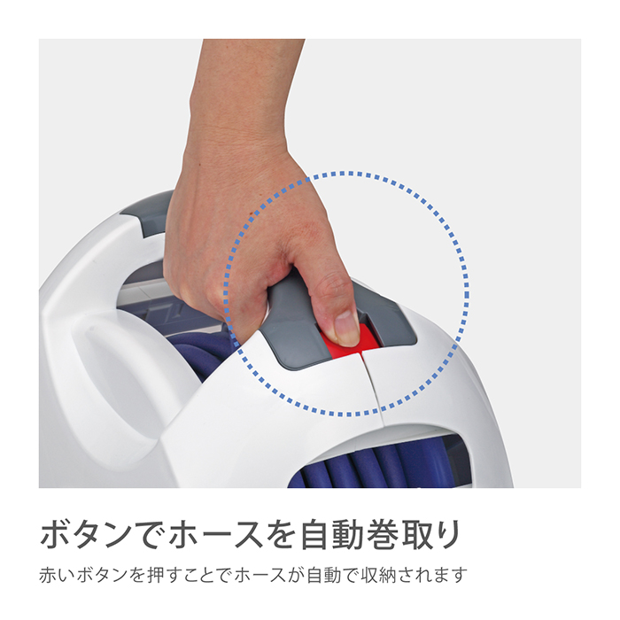 ボタンを押すだけでホースを自動巻き取りできる便利な散水ホースリール。