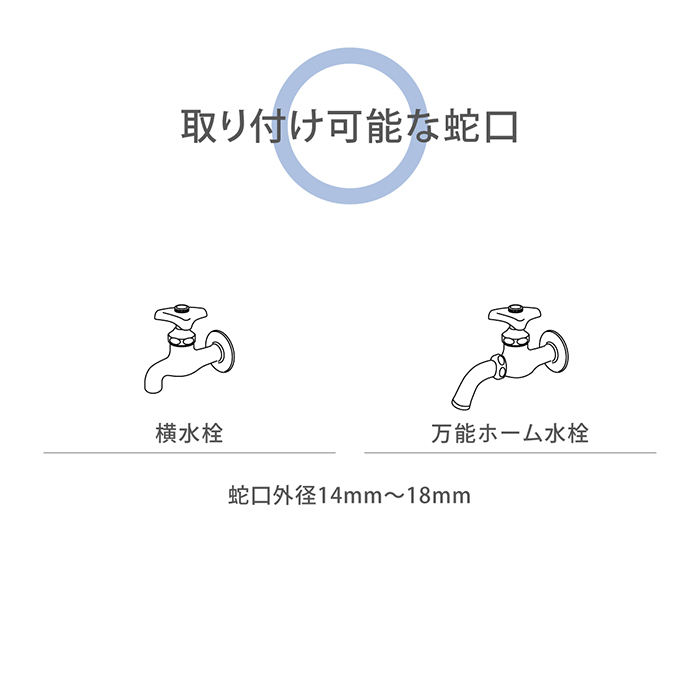取付けられる蛇口は横水栓(蛇口径14-18mm)、万能ホーム水栓(蛇口径14-18mm)です。