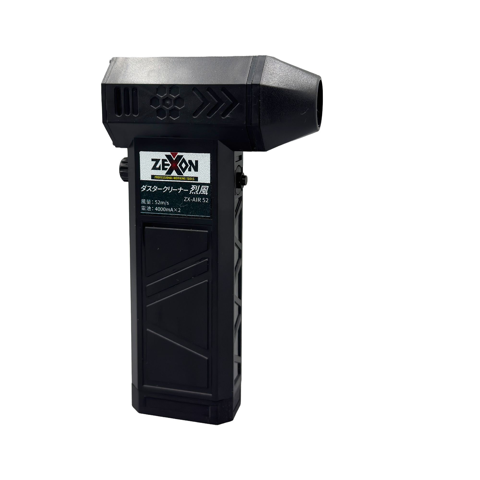 「ゼクソン ダスタークリーナー烈風 ZXAIR52」は、手のひらサイズでパワフルなコードレスダスター&クリーナー。最大風速52m/s、リチウムイオン電池搭載。サイズ15×8.6×4cm、約300gの軽量設計。風量無段階調節+USBC充電対応により、車内清掃・工作機器のホコリ飛ばし・工具手入れなどに最適。