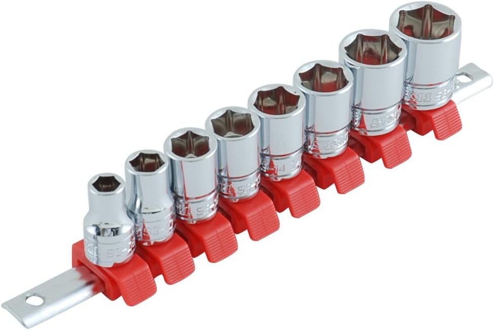 SK11 ソケットセット SHS308Mは、差込角9.5mmのミリサイズ対応ソケット8個組セットです。面接触加工によりボルトやナットの角に配慮した形状で、作業時のなめりを抑えやすい設計です。新型ソケットホルダーを採用し、ワンタッチ操作でソケットの着脱がしやすく、整頓保管にも便利です。六角ボルト(ミリ)に対応し、自動車やバイク、機械まわりなど幅広い締付け作業に使いやすい基本セットです。