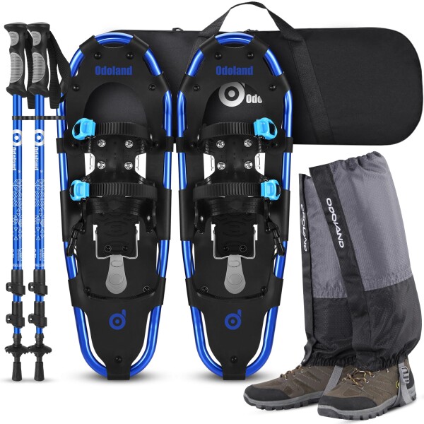 Odoland 4-In-1軽量スノーシューセット アルミスノーシュー トレッキングポール 防水スノーゲイター 雪山 登山 かんじき ワカン 収納袋付き 男女兼用 着装簡単,ブルー,L (73-113kg)