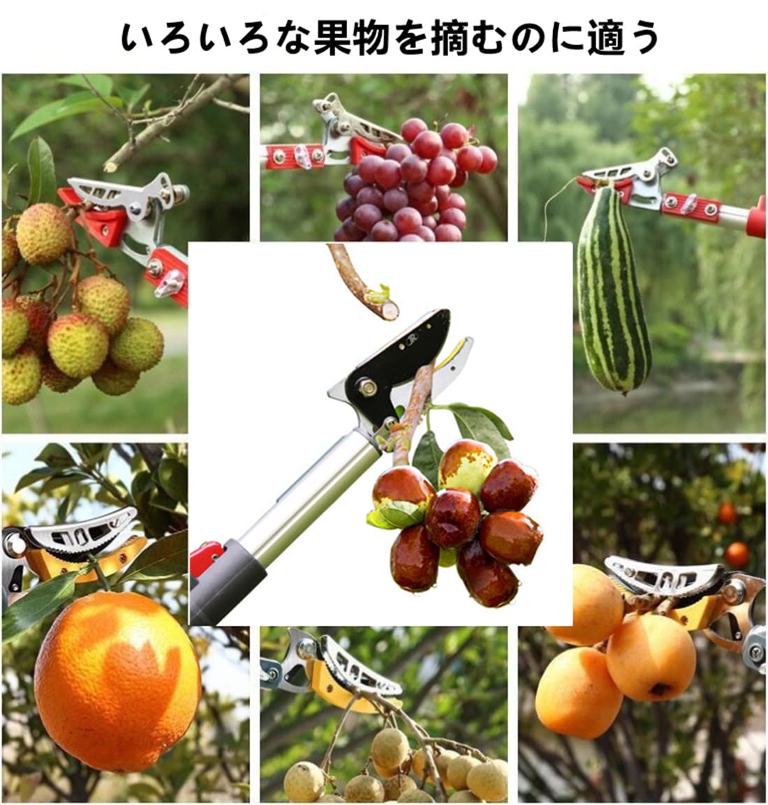 果物摘みキャッチ機能が付いているため、カットした枝や果実を落とさず掴んだまま回収できます。余分な枝を剪定余分な枝を剪定して木を健やかに成長させ、果実の収量を増やします。太い枝はノコギリでカットノコギリが付属しており、15ミリ以上の太さで切れない枝は、ノコギリをヘッドに付けて使用可能です。