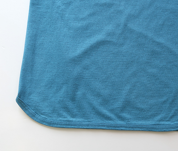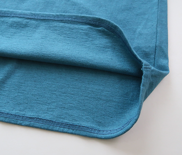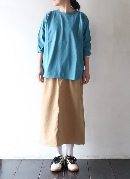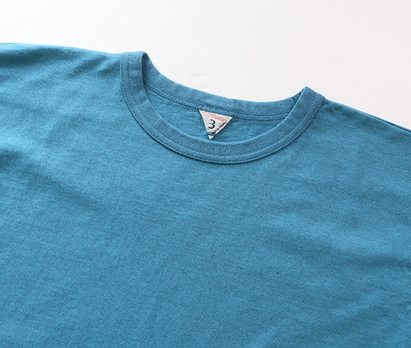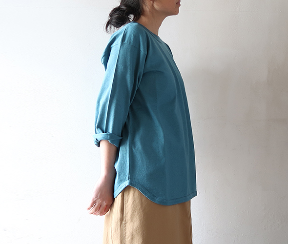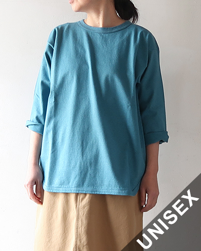 ナチュラルなムラと柔らかな風合いが特徴のTシャツです。製品量産後に出てしまう残反や裁断くずを寄せ集め、それを粉砕して綿(ワタ)に戻すのが反毛という手法で、フィルメランジェで使用した綿の素材を反毛にかけた綿と、オーガニックコットンを掛け合わせ、新たに開発された天竺です。肉感、度目ともにややしっかりした目で、安心感のある素材を使用しています。ややゆとりを持たせたシルエットに、バランスの取りやすい七分袖、裾はラウンドカットで、インナーとしても一枚着としてもロングシーズン活躍します。シンプルだからこそ素材の良さが際立つアイテムです。