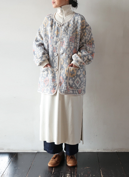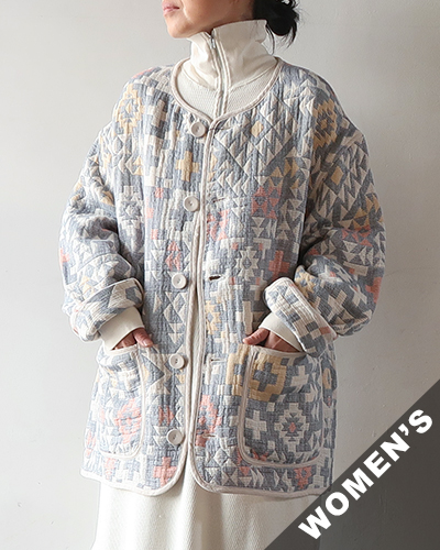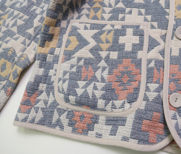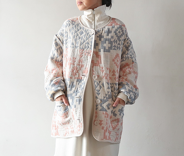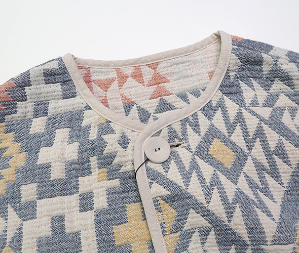 綿素材の3重織りガーゼに太番手糸を入れて軽量かつ嵩高に仕上げ、ジャカードにすることで立体感のある柄を表現した存在感のあるジャケット。表と裏のカラーリングが異なり、リバーシブルで着用する事ができます。縁やポケットまわりにはパイピングが施されており、表情にアクセントをプラス。軽量でシルエットもゆったりしているので着心地が良いです。