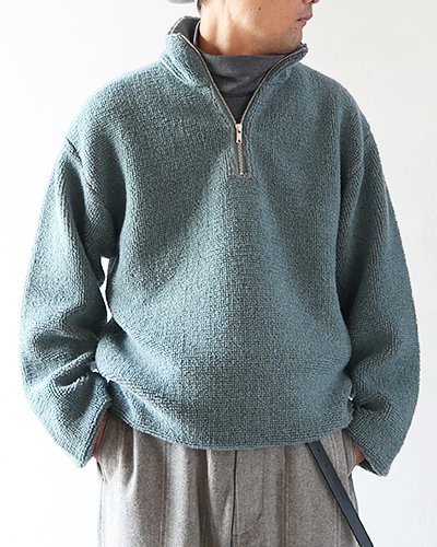 フィルメランジェ定番のフリースボアが、クルクルと表情のあるループの長いパイル編地のニットで再現されています。糸はオーストラリア産の、マイクロンが細く希少なラムウールを用いて仕上げられており、ふんわりとボリューム感がありながら軽やかであたたかです。上糸と下糸を配色にすることで、色合いに奥行きが生まれています。