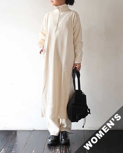 ムラ感たっぷりの糸を使用することにより、古着のような柔らかな表情に編み立てられたワンピース。ハニカム柄の組織で編みたてたサーマル素材は横に緩みにくく、 長くご愛用頂ける仕上がりとなっています。
