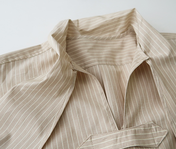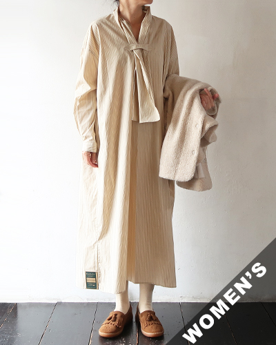 スーピマ綿を使用した、さらっと高密度の素材感の良さを感じていただけるシンプルなロングワンピース。優しい色合いの、すっきりとしたストライプ柄で上品な印象です。特徴はなんといっても、首元に付いたループにスカーフを通すデザイン。巻き方をアレンジするのもおすすめです。両サイドにスリットがはいっているので足さばきも良く、パンツなどと重ね着にもぴったり。