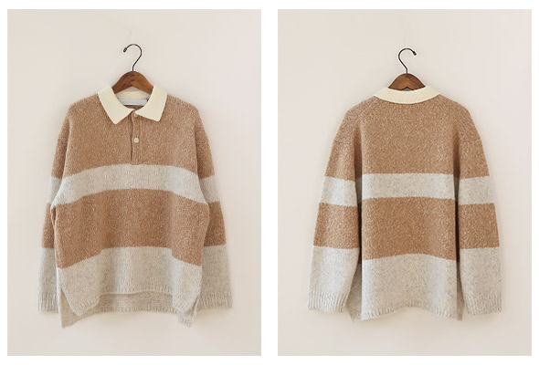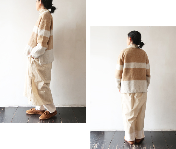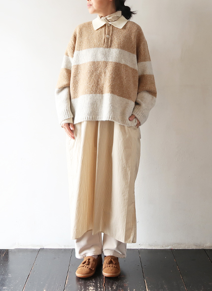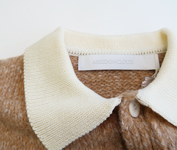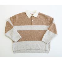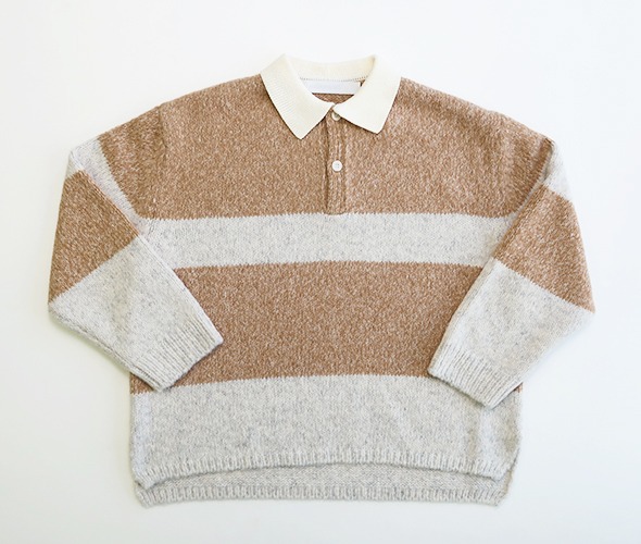 イギリスの私立の学校等でよく見られるラガーシャツ。配色や柄の入り方で学校の特徴を出しています。今回はトラッドな制服とスポーティーなアイテムの組み合わせに惹かれ、カットソーではなく、ニットでアシードンクラウドらしくデザインしました。糸はアルパカの中でもより繊細で滑らかさに優れたベビーアルパカを使用したブークレ糸3本を杢撚糸にして追加でループを摩耗加工し毛足を少し表現しています。紡績ブークレの為、アルパカ独自の滑らかで膨らみのある風合いでとても軽く仕上がっているのに、とても暖かいです。