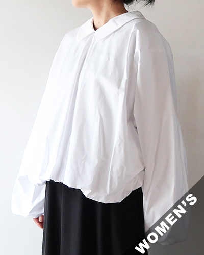 フェミニンな印象のハバーサックの新作シャツ。袖口と裾口にたっぷりとギャザーを配したボリューミーなシルエット。前後差のある着丈と2重仕立て構造もユニークなポイント。一枚で着ても存在感のある逸品です。