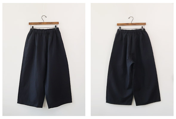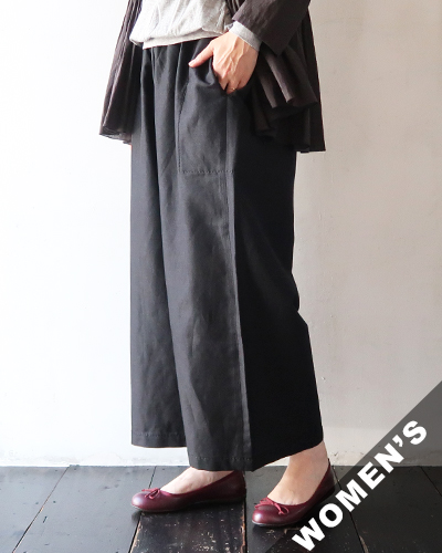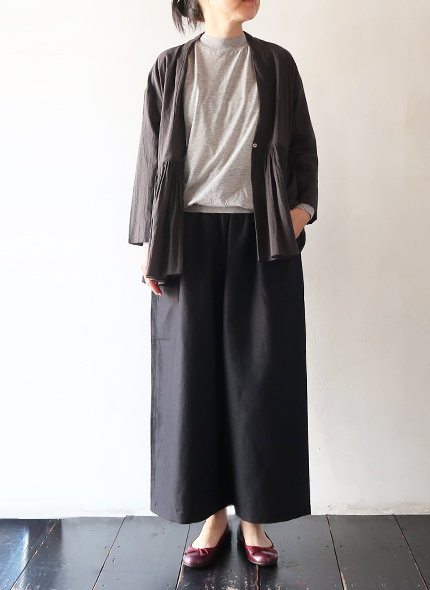 とろっと柔らかな、ウールリネン混素材のワイドギャザーパンツ。たっぷり入ったギャザーに、リラックス感のあるシルエット。程よい光沢感が素材感の良さを感じさせ、生地自体にボリューム感がないので、すっきりとした上品な印象です。ホームスパンの特徴でもある、両サイドポケットの0番ステッチもいいアクセントになっています。チラッと足首がのぞく着丈のバランス感で、穿き心地の良さは抜群!
