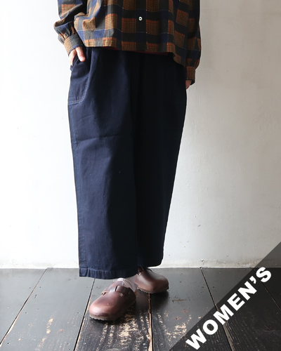 柔らかでしなやかな10ozデニム素材のギャザーパンツです。ヒップ周りにたっぷりと生地を使い、ウエスト周りのゴムでギャザーを表現したリラックス感のあるパンツです。パンツの裾には、ボタンホールを設けてありますので、ご自身で、紐やゴムを通せば、シルエットに変化も可能です。濃紺のインディゴなので、太めのシルエットでも引き締まった印象に。