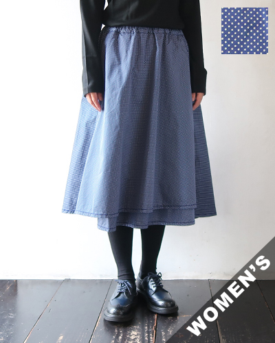 適度なハリ感としなやかさのある素材感で、着用するとフレアのシルエットがきれいに出ます。ラップスカートですがウエストがゴム仕様で履きやすく、生地の重なりも深めで安心。表は細かな水玉模様、裏の無地がめくれて見えてもポイントになるスカートです。
