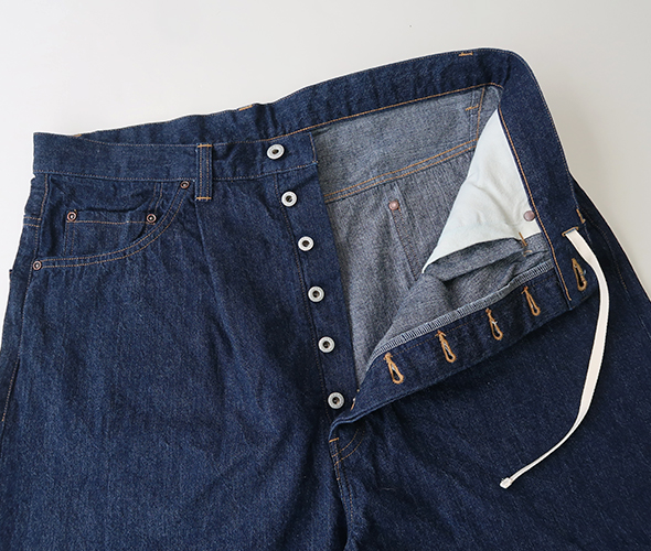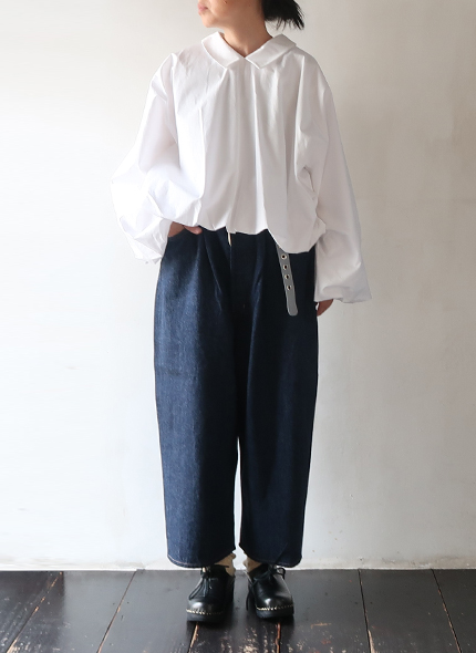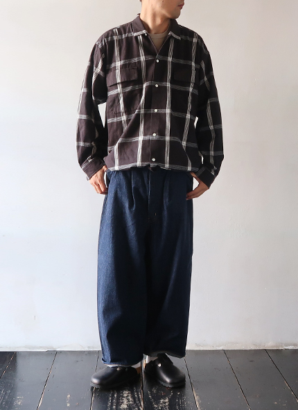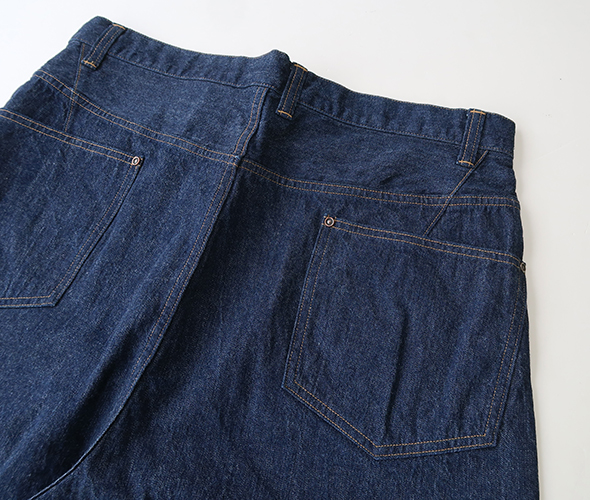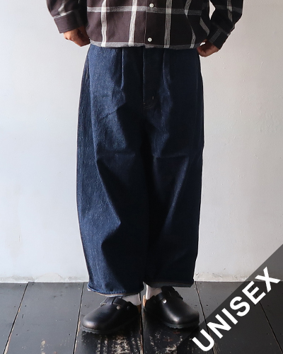 19世紀のインディゴカラーの深みの色合いを再現したワンウォッシュデニムパンツ。 深い股上とクロップ丈の、ワイドテーパードシルエットが特徴です。ベルト裏に平紐を通し、イージーパンツのように絞って穿くこともできます。フロントの深いプリーツや、後身のダーツ等、スラックスの要素を取り入れた、HAVERSACKらしいヴィンテージ感溢れる一本に仕上がっております。