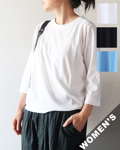 綿100%のやわらかく、肌ざわりの良い天竺七分袖Tシャツ。毎シーズンカラーバリエーションを変えて展開される定番の一枚です。お洗濯しても型崩れしにくいコットンを使用した、デイリーなアイテムです。