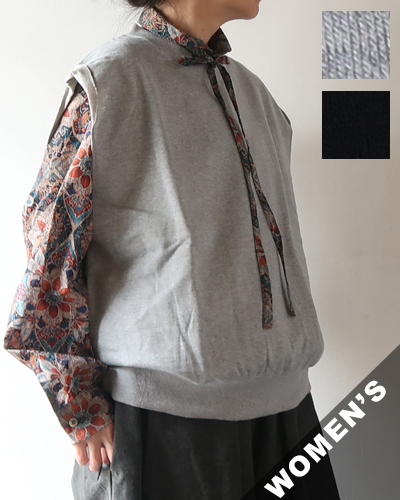 薄手のコンパクト裏毛生地を使用したクルーネックベスト。カットオフのアームホールは重ね着にぴったりな広めの作りで、クルッとひねったようなデザインがアクセントになっています。シャツやカットソーと重ね着にぴったりで、上にジャケットを羽織れるくらいの生地厚で、これからのレイヤードスタイルに活躍間違いなしのアイテムです。