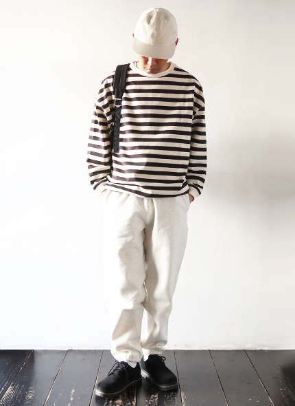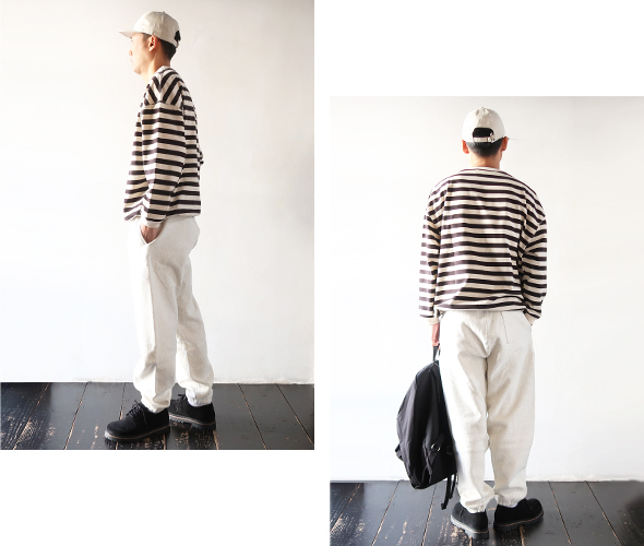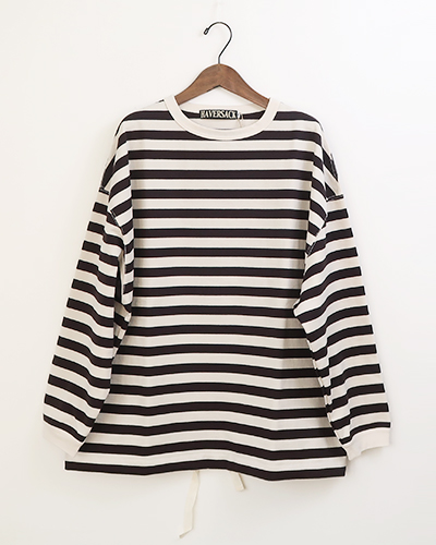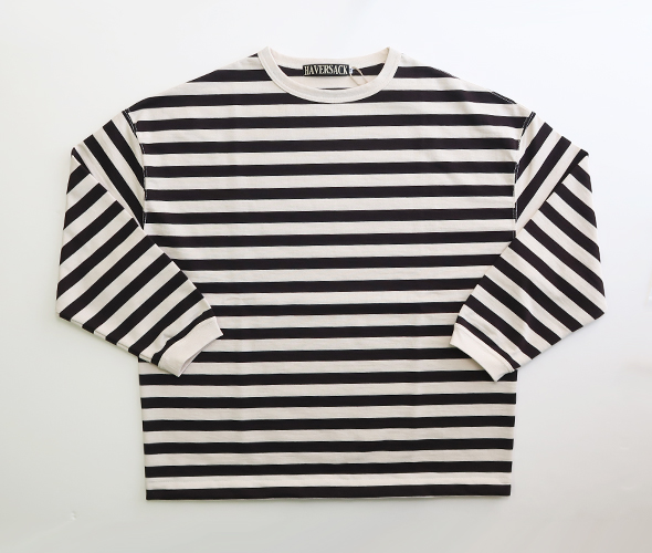 ハバーサックオリジナルの度詰天竺ボーダーを使用した、クルーネックロングTシャツ。オーバーサイズシルエットで裾には杉綾テープが施されており、絞ってブルゾン風に着用できる様に仕上げられています。