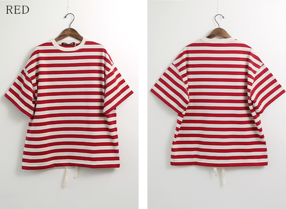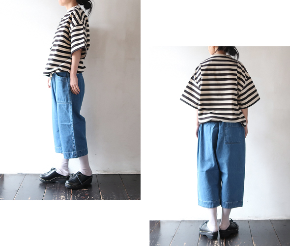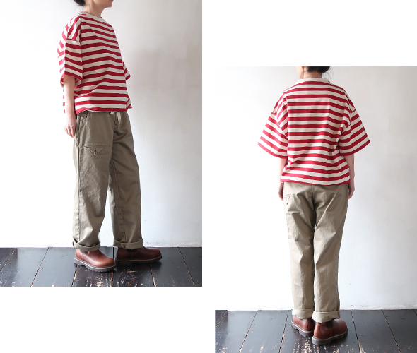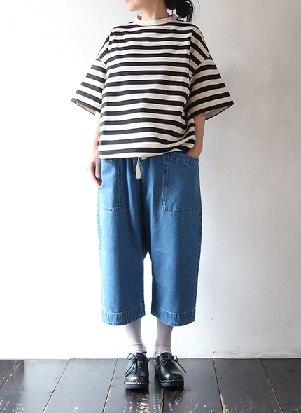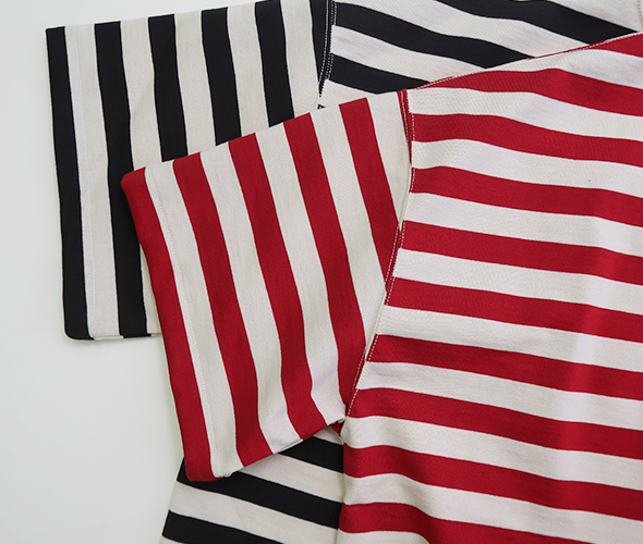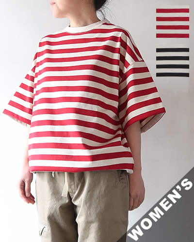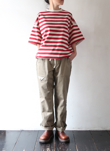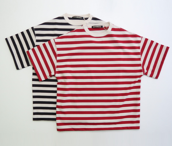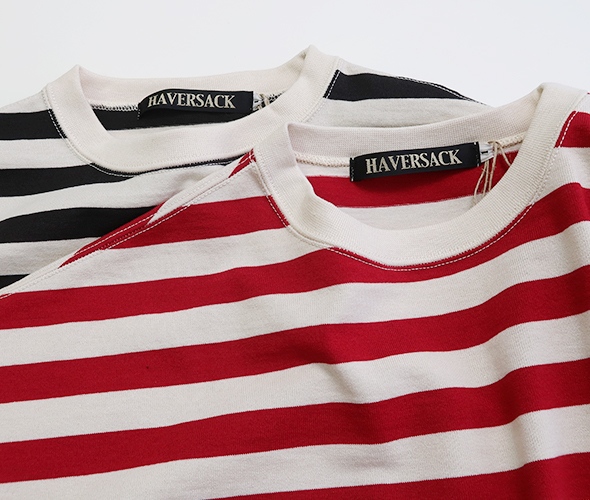 ハバーサックオリジナルの度詰天竺ボーダーを使用した、半袖Tシャツ。ゆったりとしたオーバーサイズシルエットに、裾には杉綾テープが施されており、絞ってブルゾン風に着用できる仕様で、シルエットに変化をつけられる点もポイント。