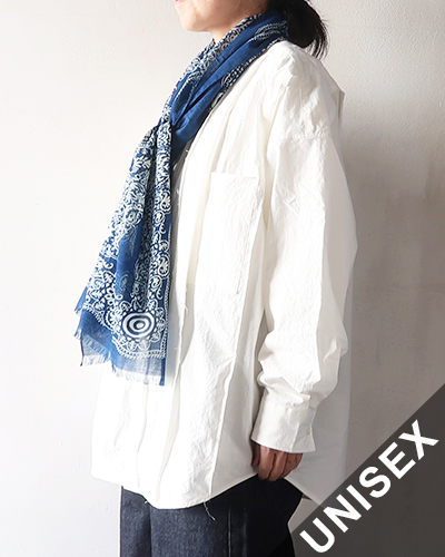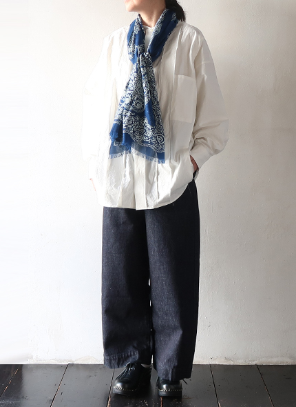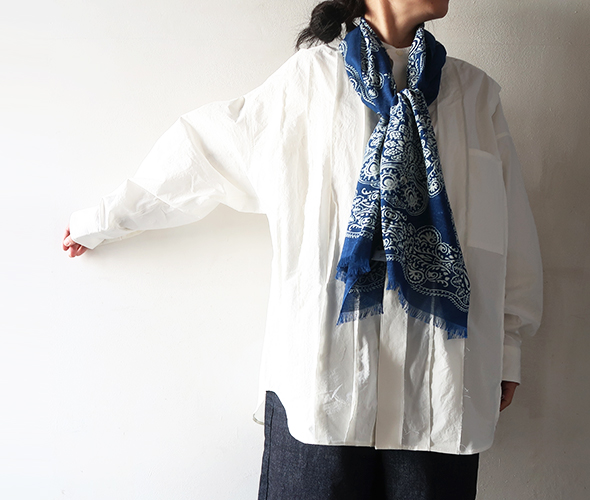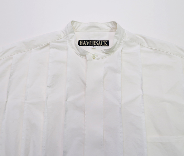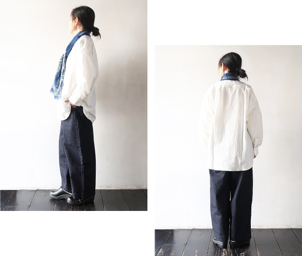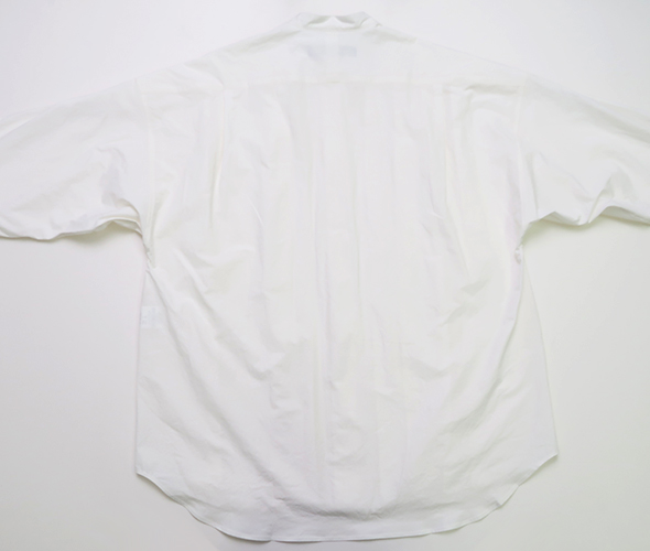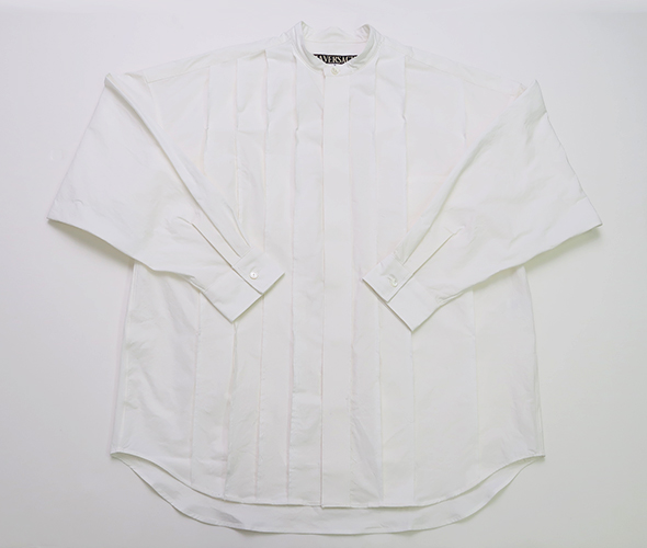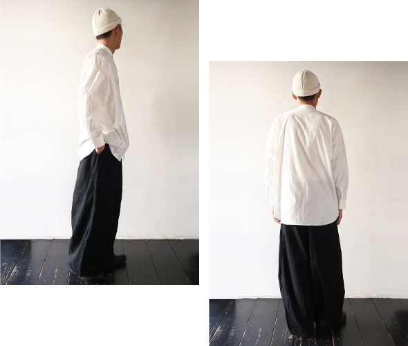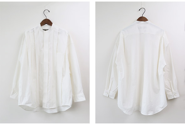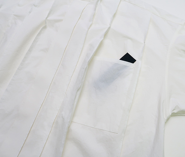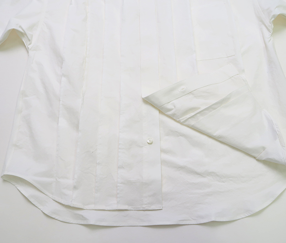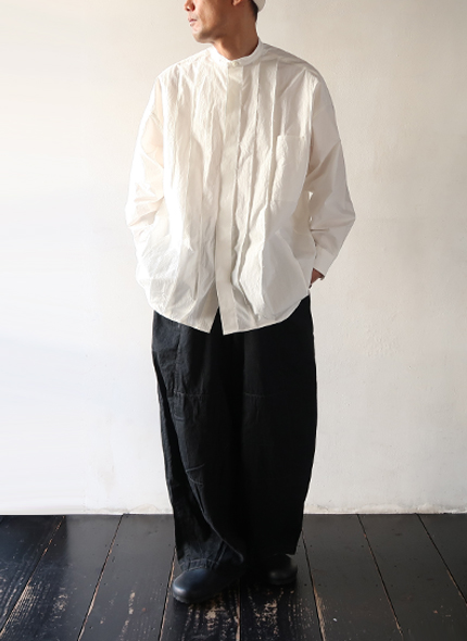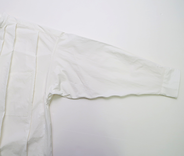 適度なハリ感をもつオーガニックコットンタイプライター生地をプリーツシャツで表現した本アイテム。オーバーサイズフィットで一枚で着ても存在感があります。プリーツの端は切りっぱなしなので、洗いざらしで着ても良い雰囲気。
