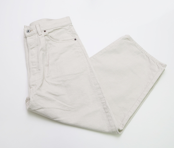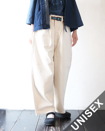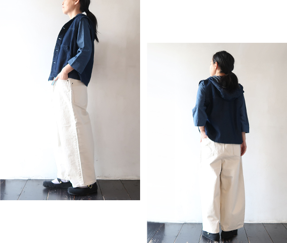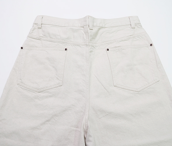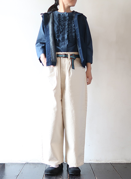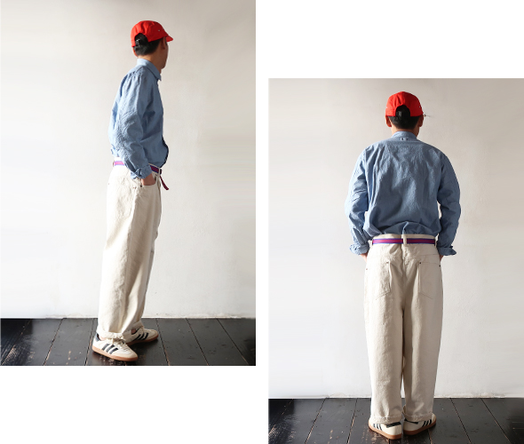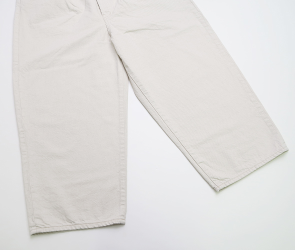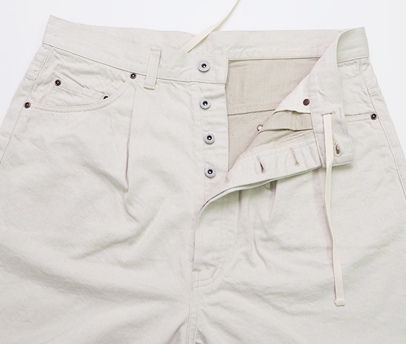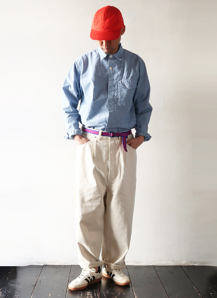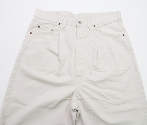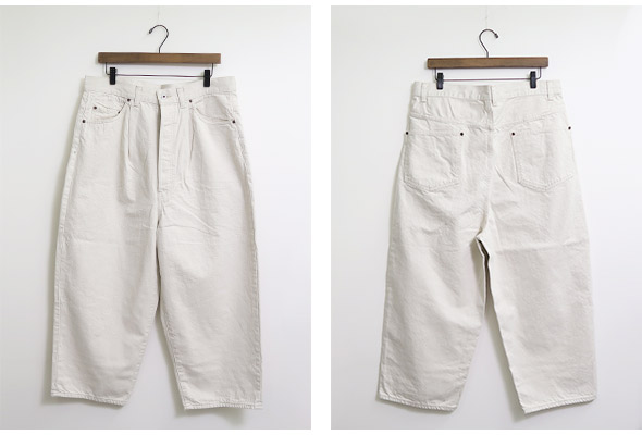 ワンウォッシュの先染めライトデニムを使用した、ナチュラルな風合いが新鮮なファイブポケットパンツ。ウエストを大きく設定し、ベルトループに加え、ベルト裏に平紐を施し、イージーパンツのように絞って履ける仕様です。深い股上とクロップ丈のワイドテーパードシルエットが特徴的ですが、フロントの深いプリーツや後ろヨークのダーツ等、スラックスの要素を取り入れた細やかなディテール満載。
