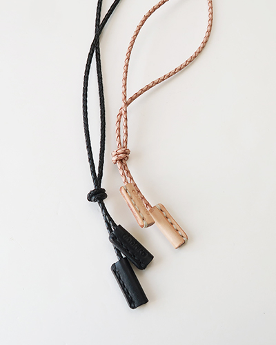 LOOP TIEをモチーフにしたネックレスです。素材はイタリアンスムースレザーを使用し、1点1点手作業で作られています。長さは結び目をスライドさせて調整できます。丁寧に編み込まれたレースは、シンプルな丸紐タイプに比べ、しなやかで表情豊か。シャツやカットソーに、馴染んでくれますので、コーディネートも選びません。コットン巾着付属。