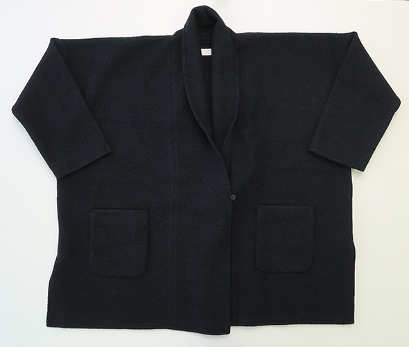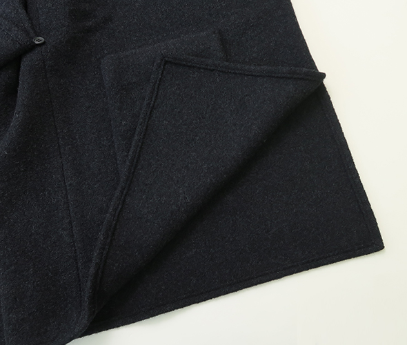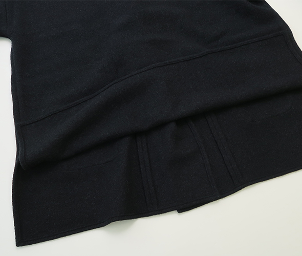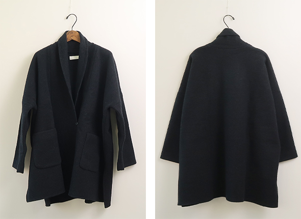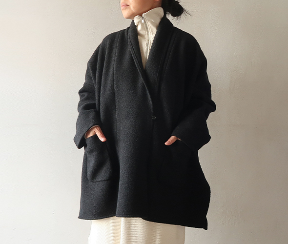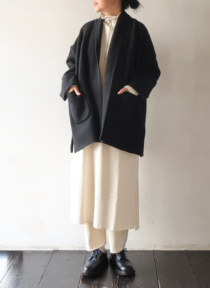 evam eva定番人気素材のプレスウールを使用したローブ。柔らかなウール糸で編んだニット地を圧縮することで、しっかりとした肌当たりの良い温かな生地に仕上がっています。裏地のない軽やかで落ち感のある、ゆったりとしたシルエットに、大きめのポケットがアクセント。洗練された上品なデザインに、さらっと羽織れる気軽さが魅力的で、さまざまなシーンでお使いいただけます。