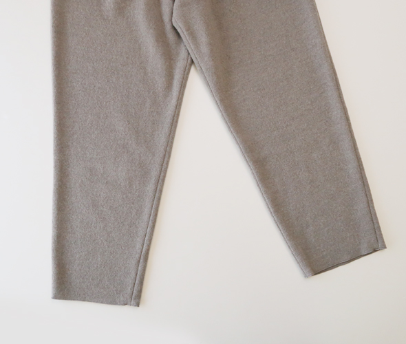 evam eva 定番のプレスウールシリーズのパンツ。柔らかなウール糸で編んだニット地を圧縮することで、しっかりとした生地に仕上がっています。ヒップ周りには程よいゆとり、裾にかけてゆるやかなテーパードシルエット。ウールなのに、見た目にもきれいで保温性も良く、寒い季節におすすめのパンツです。