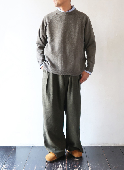 膨らみの良いメリノウールをプレスして仕立てられたラフな印象のニット。カジュアルさを抑えた上質な大人の着こなしにおすすめです。程よい厚みがありつつ軽やかで、ウール100%のあたたかい素材は普段使いでも重宝するアイテムです。