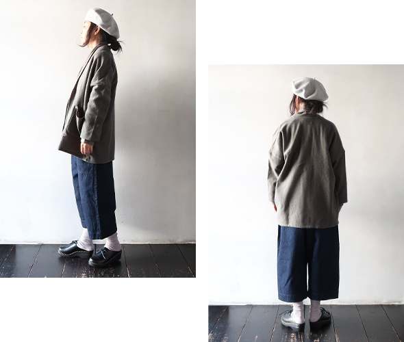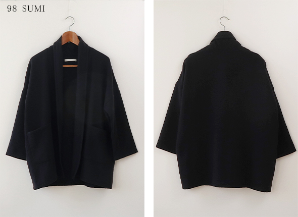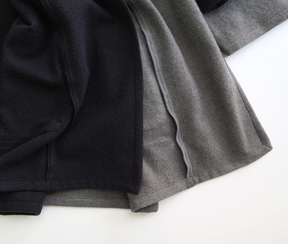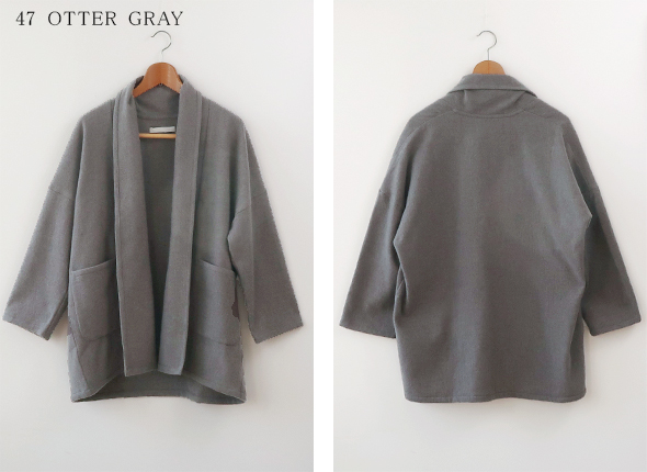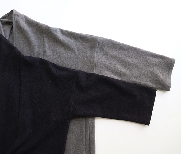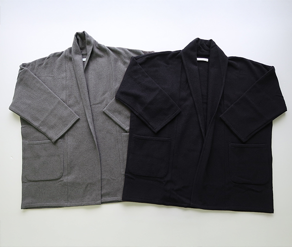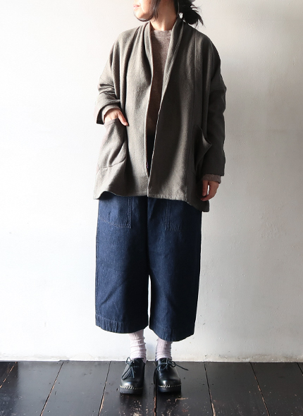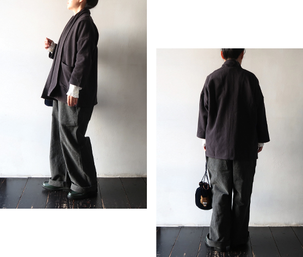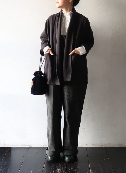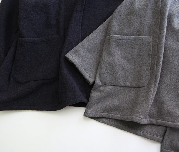 本来はニット用に使用される甘撚りの糸を織り生地に使用されているので、糸が甘撚りであることにより、暖かな空気を含みやすく軽い着心地のショートローブ。ふんわりとした あたたかみのある素材感で、さらっと羽織るだけで雰囲気が増します。