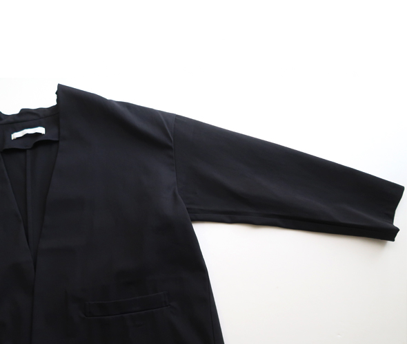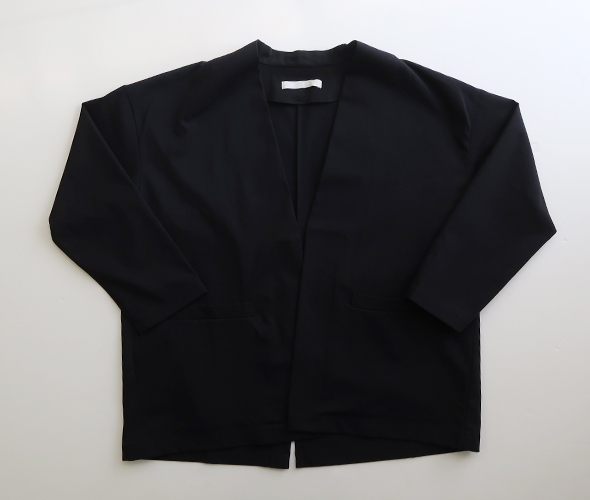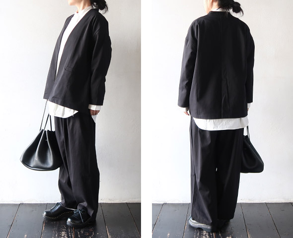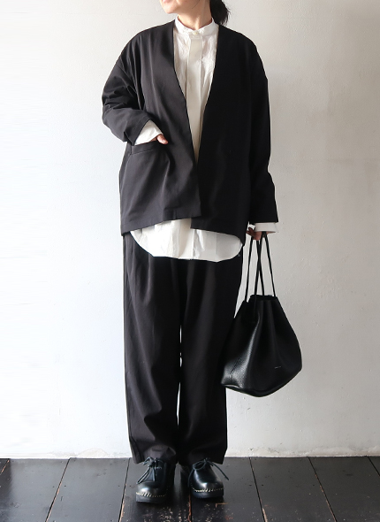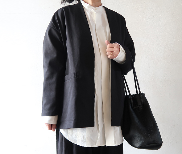 シンプルなデザインの羽織りやすいトップスです。同素材のパンツに合わせてオケージョンにもおすすめ。