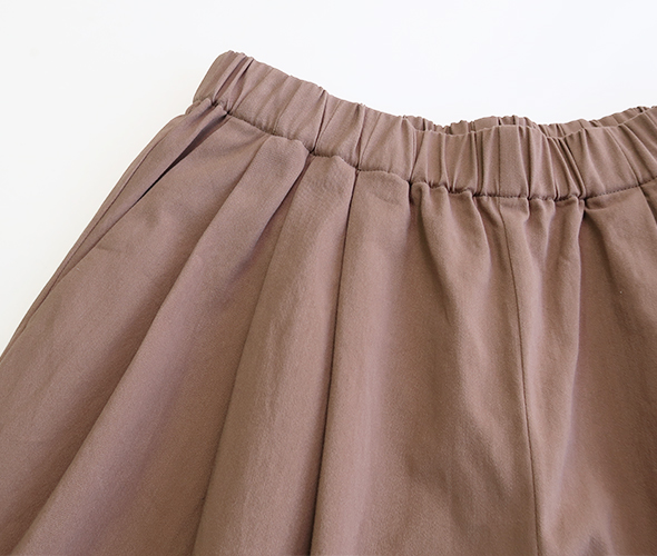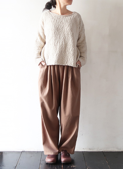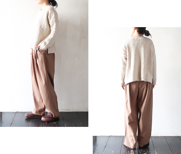 柔らかな素材感と優しい色でコットンニットなどにも相性が良いです。カジュアルすぎない印象。