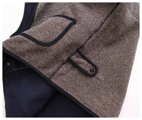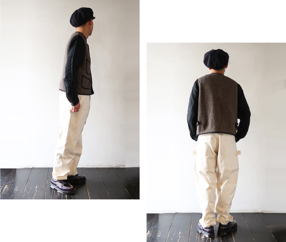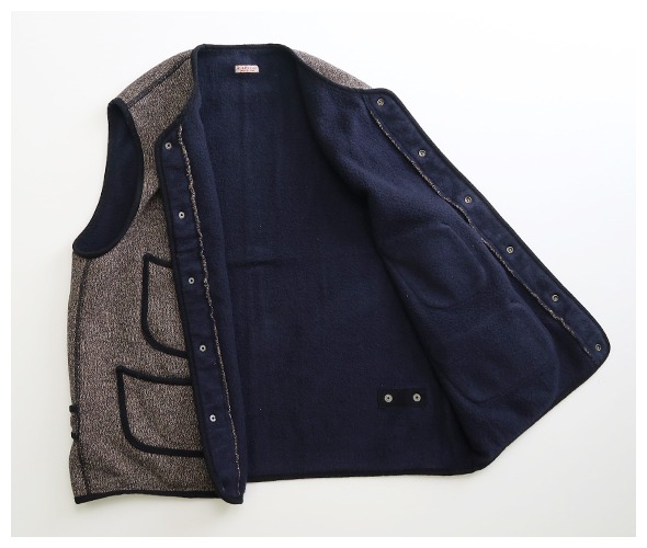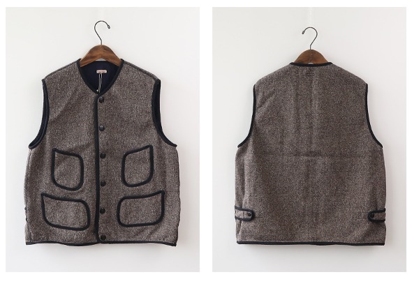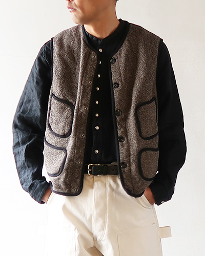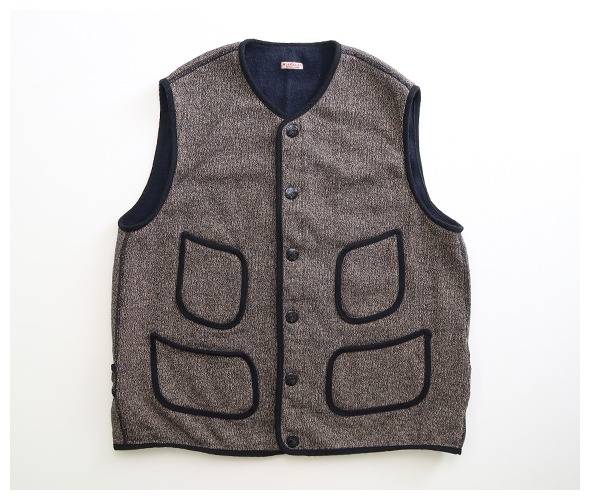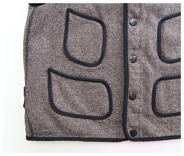 しっかりと厚みのある杢感のある裏毛生地のヴィンテージ感のあるワークベスト。黒い縁取りに、個性的なポケットのシルエットが印象的です。着脱が楽ちんなスナップボタン仕様になっています。