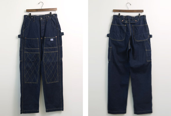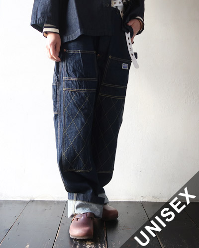 オーバーオールを日常に穿きやすいパンツにアレンジした一点。オーバーオールの前当てをカットし、ウエストをぎゅっと絞ったようなオーバーサイズシルエットに、前、横、後ろ様々な場所にポケットを取り付けています。無骨なワークパンツの要素を感じさせながらも、スタイリングに取り入れやすい仕上がりで、程よい厚みの11.5ozデニムは、通年活躍する素材感です。
