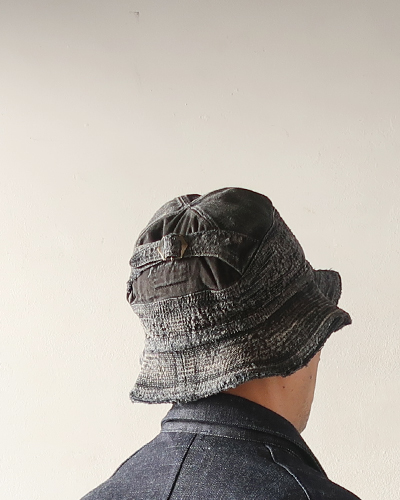 縦糸と横糸に黒染めされた糸を使用して織り上げた、ブラック×ブラックデニム素材のKAPITALの定番人気の老人と海HAT。無数のステッチや大胆なダメージ加工が施された、こだわりの詰まったディテールに仕上がっています。ブリムとクラウン部分に、丁寧に何度も縫いこまれたステッチが施されており、ステッチが入る事で補強をされた様なしっかりとしたハリがあります。抜群の存在感を発揮しており、アクセント小物としても楽しんでいただけます。