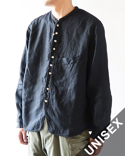 首元がすっきりと見えるスタンドカラーと、繊細なデザインのコンチョボタンが特徴的なスタンドペニーシャツ。生地にはガーゼリネンのヘリンボンを使用しており、肌に馴染む着心地になっています。洗練されたシンプルなデザインなのでドレッシーなコーディネートにもおすすめな一枚です。