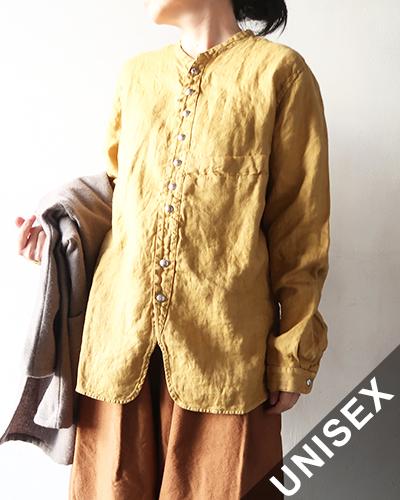 首元がすっきりと見えるスタンドカラーと、繊細なデザインのコンチョボタンが特徴的なスタンドペニーシャツ。生地にはガーゼリネンのヘリンボンを使用しており、肌に馴染む着心地になっています。洗練されたシンプルなデザインなのでドレッシーなコーディネートにもおすすめな一枚です。