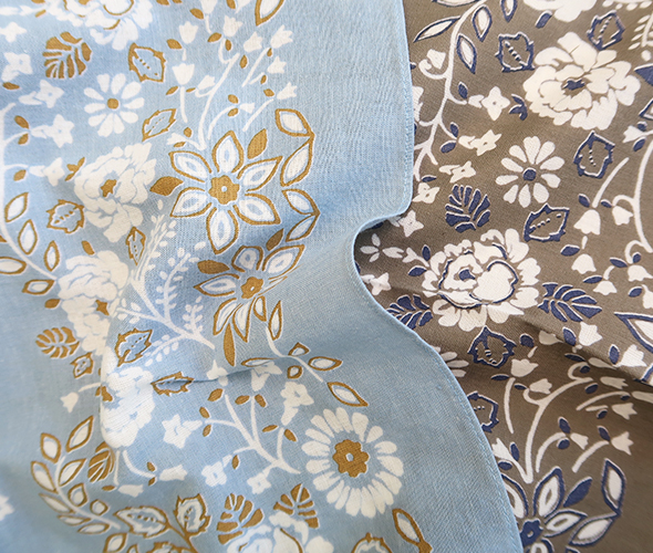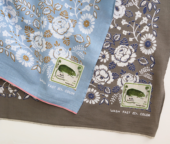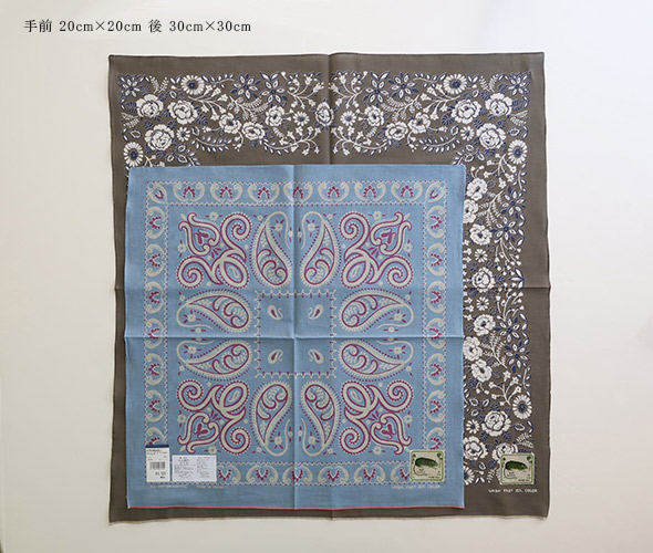 少し大きめの二尺巾のセルビッチバンダナ。草花のモチーフを組み合わせた華やかなデザインです。