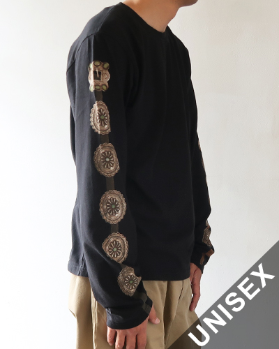KAPITALならではの、ベーシックなロングTシャツの両袖にあしらわれたコンチョベルトプリントが存在感のあるロングスリーブTシャツ。ブラックカラーにプリントがとてもよく映えます。柔らかく、着心地の良い天竺素材で季節を問わず活躍しそう。