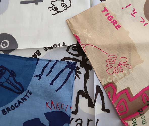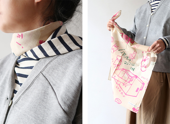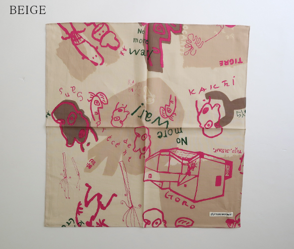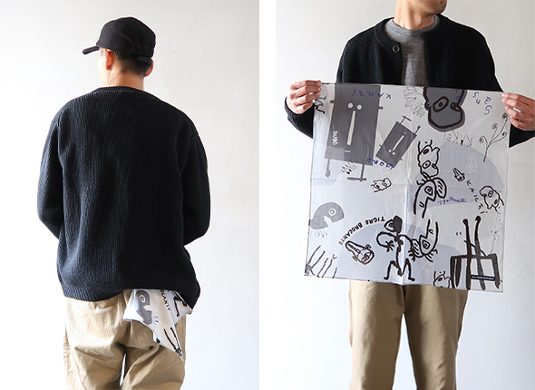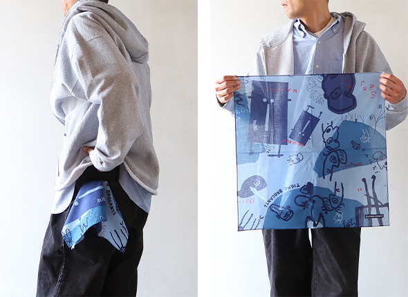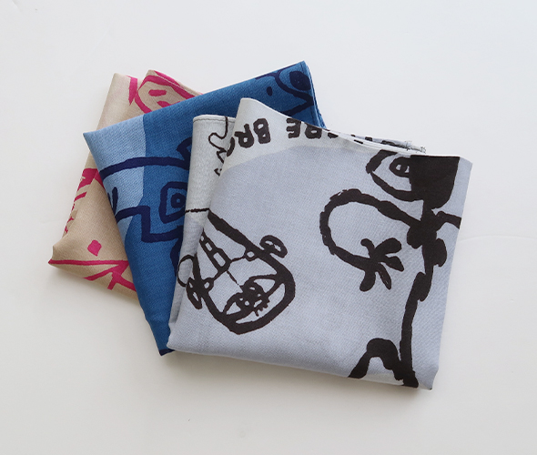 彫刻家・掛井五郎氏の作品にインスパイアされたユニークな柄が特徴のバンダナ。素材には、柔らかなコットンガーゼ生地を使用しており、肌触りが良く、吸水性があり乾きやすいので、ハンカチとしても活用できます。首に巻いたり、バッグに結んだり、コーディネートのさりげないアクセントにおすすめです。