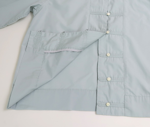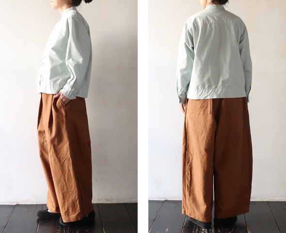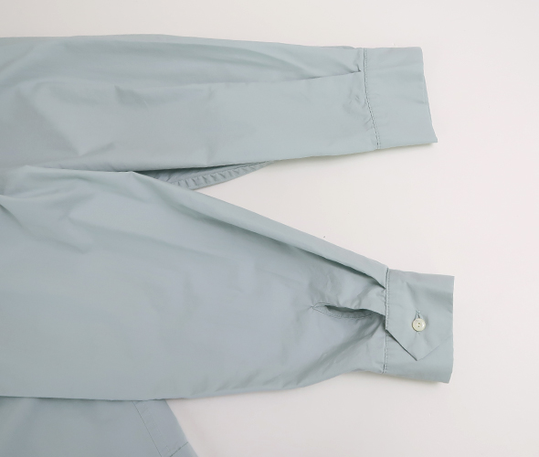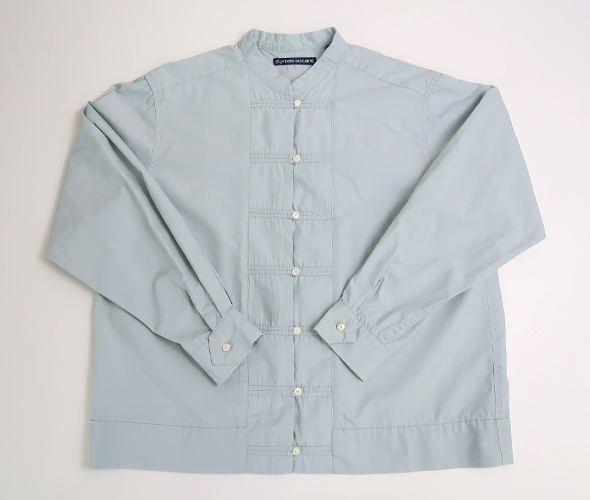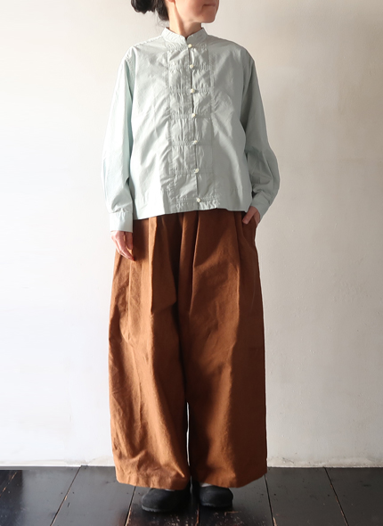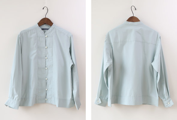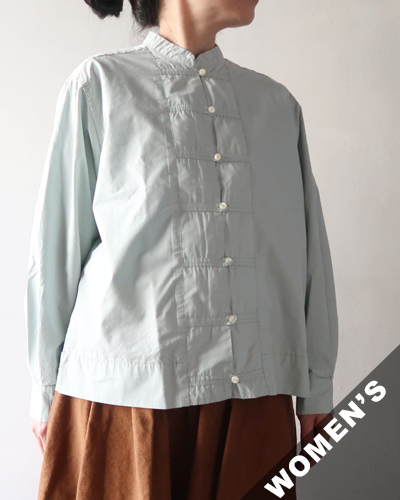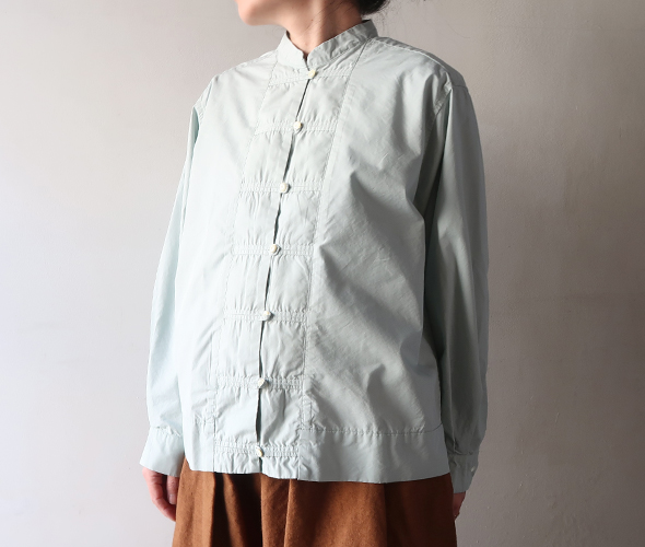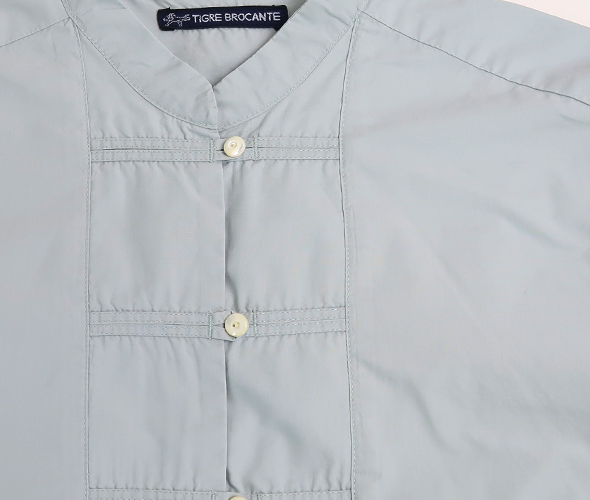 これからの季節にぴったりな柔らかなミントカラーが綺麗な TIGRE BROCANTE のチーパオ釦シャツ。少し光沢感のある滑らかなコットンテンセル素材。すっきりとしたシルエットのチャイナシャツのようなデザインで、ジャケット風に羽織としても着用いただけます。