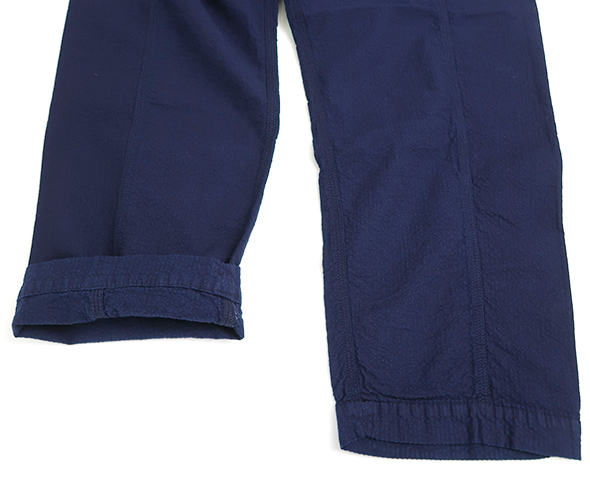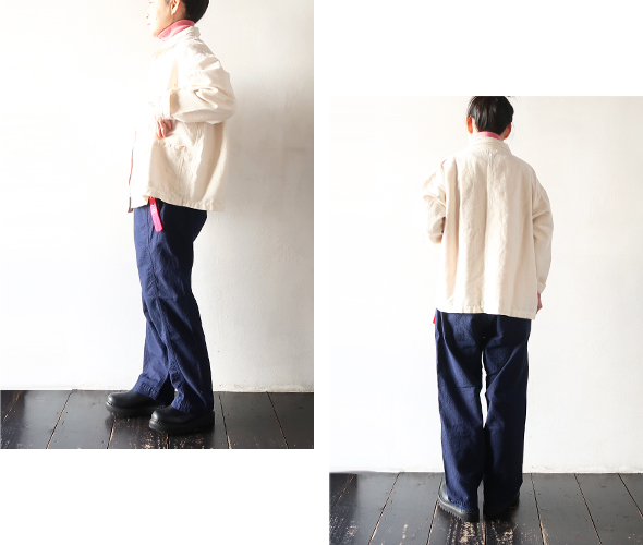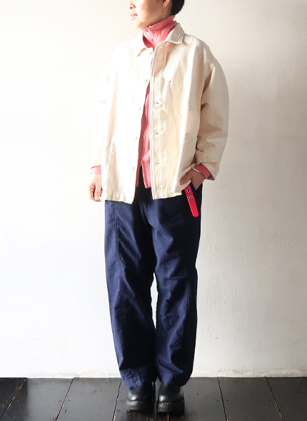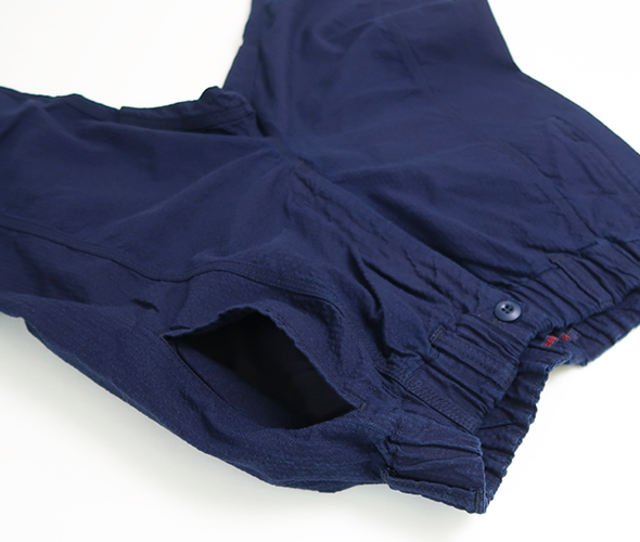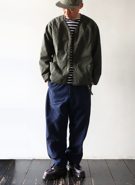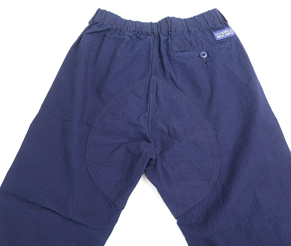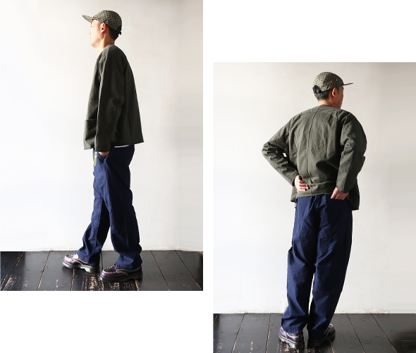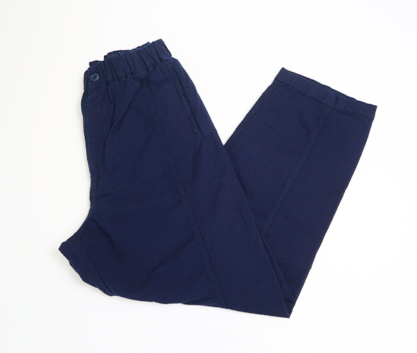 ヒップ部分を強化した切替えと、ゆるめのテーパード、カジュアルに穿きやすいボルダーパンツです。独特の凹凸感のあるインディゴドビー生地を使用しているため、肌触りは柔らかでも強度もあるので、経年変化を楽しめます。